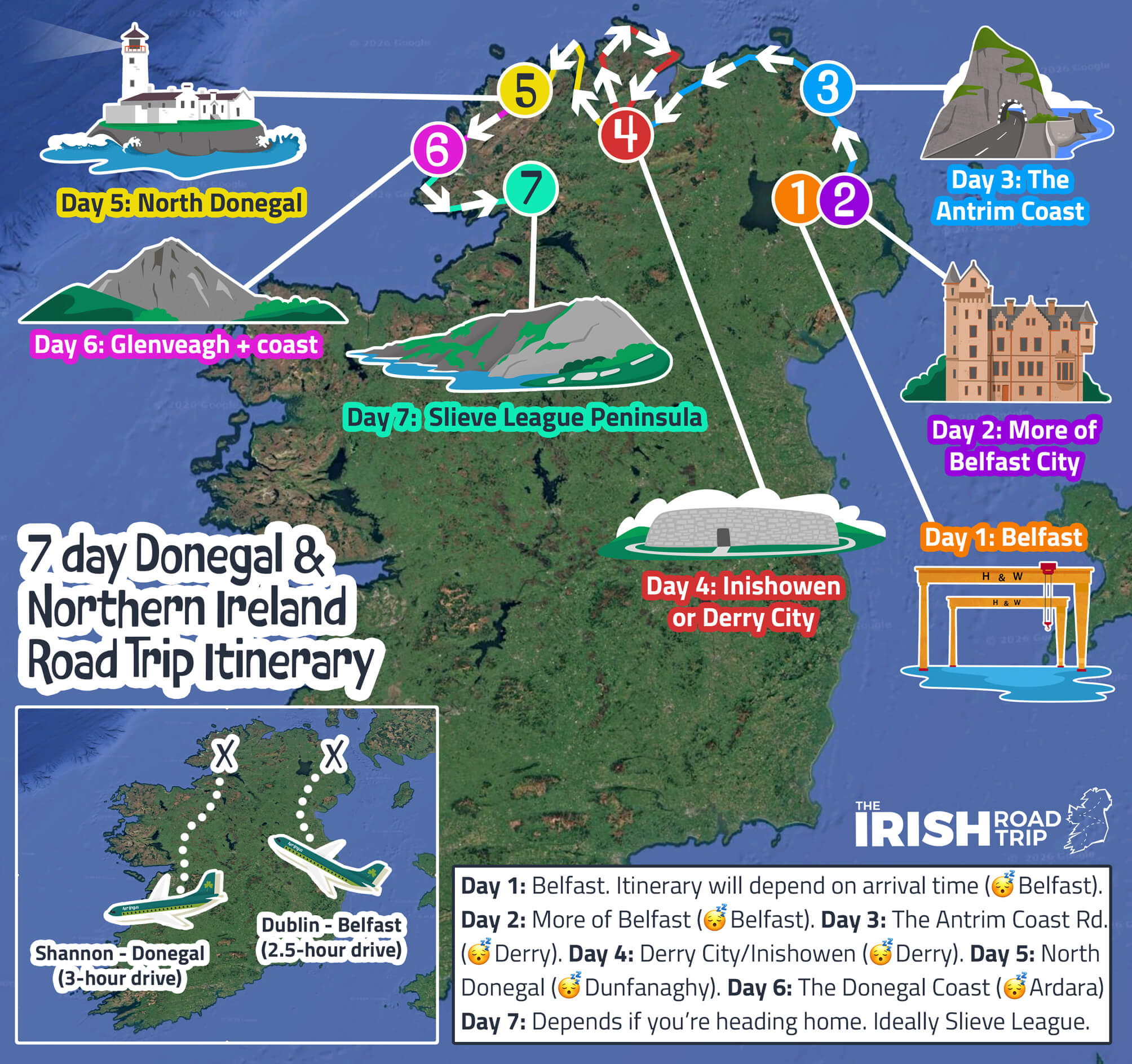 - Flying in/out of Dublin: Spend 1 day in Dublin to relax after the flight. On day 2, get up early and head to Belfast. Days 3 – 6 are the same as on my map above. Day 7 should be spent travelling back to Dublin