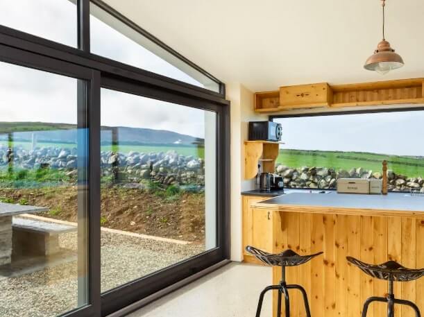 The main living area boasts a 270-degree view of the Atlantic, thanks to a floor to ceiling window (above) that overlooks Liscannor bay and the Cliffs of Moher.