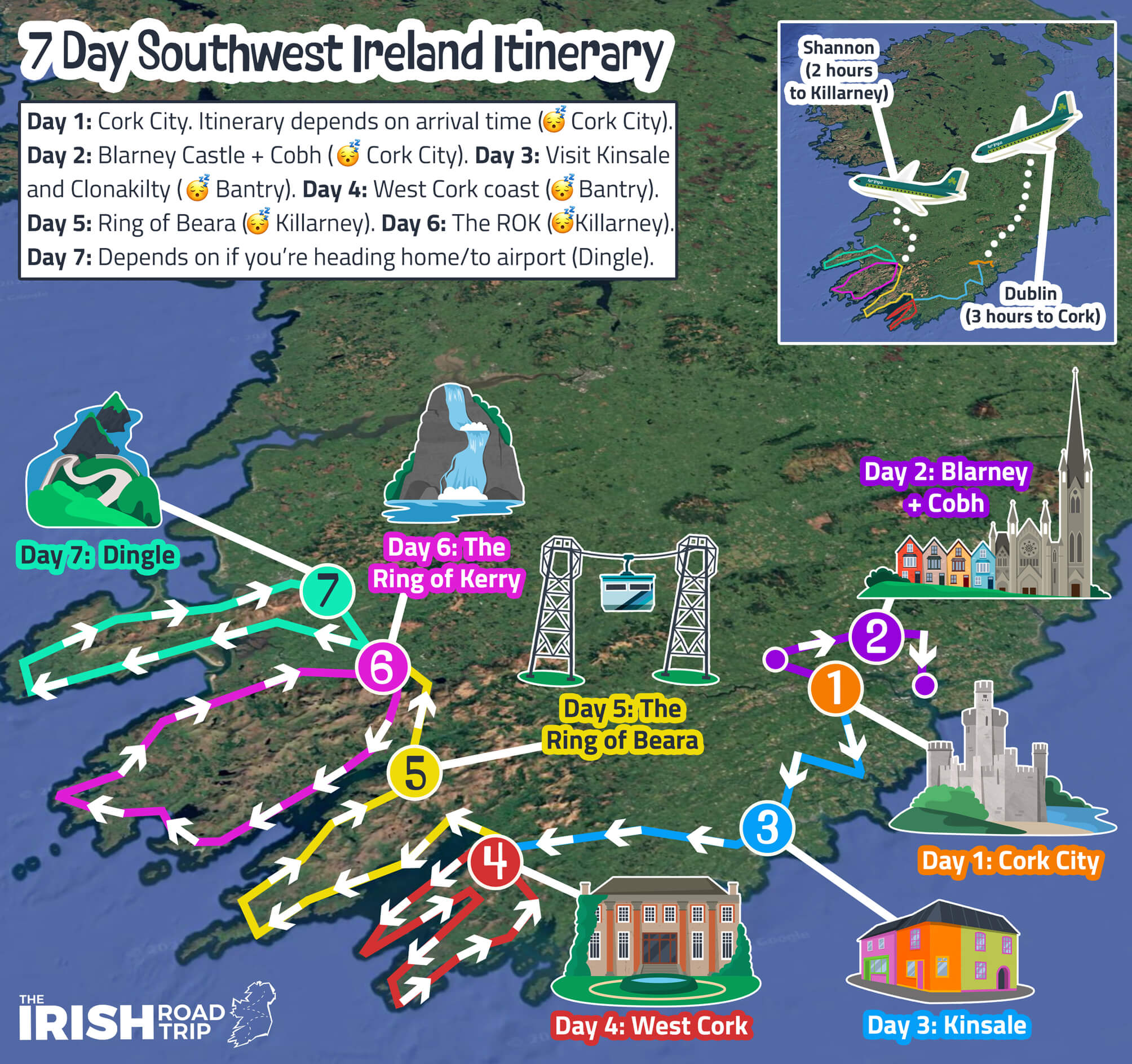 - You’re flying in/out of Dublin: Spend 1 day in Dublin to give yourself time to rest. Then spend night 2 in Cork City (visit Cobh and Blarney en route). Keep days 3 and 4 the same. Skip Beara. Do the ROK on day 5 and Dingle on Day 6. You then have day 7 to get back to Dublin (only works if you have a late flight).